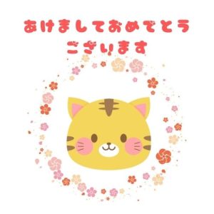 かわいい虎の年賀状無料LINEスタンプ「2022年 寅年 虎と梅の花あけましておめでとうございます」