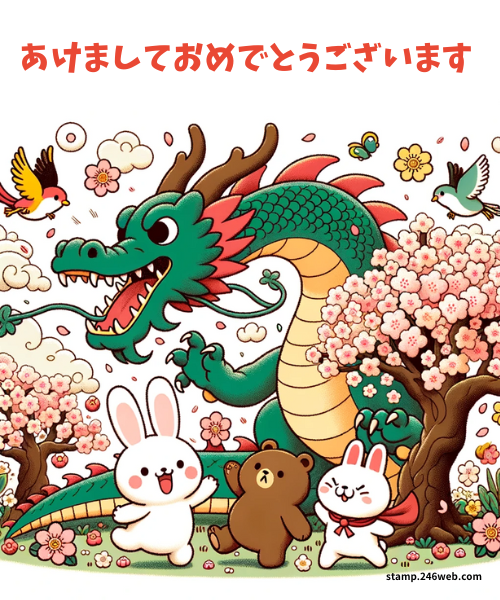 年賀状無料LINEスタンプ「辰年 龍と梅の花とうさぎと熊 あけましておめでとうございます」
