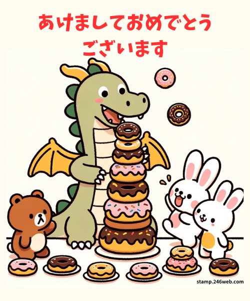 年賀状無料LINEスタンプ 2024年 辰年「年賀状 龍(竜)ドーナツ あけましておめでとうございます」