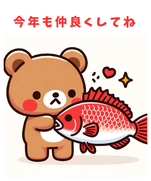 年賀状無料LINEスタンプ 「年賀状 熊と鯛 今年も仲良くしてね」